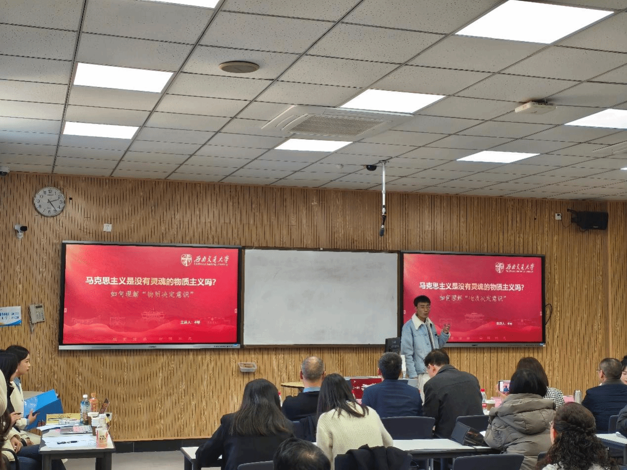 下午,来自省内各高校的41位原理课教师分组进行教学竞赛。我院马克思主义基本原理教研室袁雨宸老师以《马克思主义是没有灵魂的物质主义吗?——如何理解“物质决定意识”》为题,运用“精神追求有何意义?精神为何空虚?996为何不是福报?过去哲学家没常识吗?”连环追问引入课堂,深入浅出,最终赢得本次年会教学竞赛一等奖。