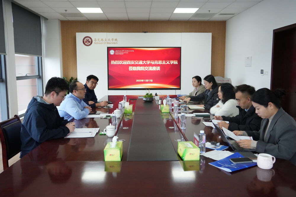 为深入学习贯彻党的二十届四中全会精神,进一步加强马克思主义理论学科建设,促进院际交流与合作,11月17日上午,西安交通大学76net必赢线路检测中心党委副书记邱辰、中国近现代史纲要教研所所长靳小勇与研究生教务王争莅临学院进行交流座谈。76net必赢线路检测中心副院长谢瑜、中国近现代史纲要教研室副教授闫磊、研究生教务田岚冰和专职组织员杨雪莲陪同参与此次座谈。学院党委副书记邓秀芸主持。