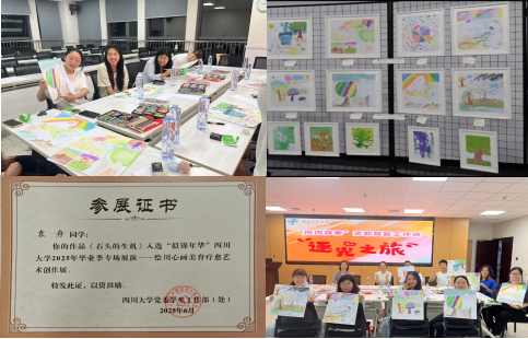 工作坊分别邀请76net必赢线路检测中心党委副书记邓秀芸、计算机与人工智能学院党委副书记肖静、四川大学学工部艺术教育中心教师令狐波、外国语学院辅导员赵敏聪、机械工程学院辅导员张翔、76net必赢线路检测中心辅导员赵子涵担任导师。首期工作坊中,令狐波带领学员们以“种子的漂流”为主题开展接力绘画创作,帮助学员具象化内心期待,更通过对他人画作的即时解读触发自我认知反思。“个体独特性”与“集体共生性”在这次艺术与心灵的沟通中得到直观呈现,生动诠释了“每个人都是独特星球”的理念。同学们的作品还应邀参加了四川大学“绘川心画”美育疗愈艺术创作展。