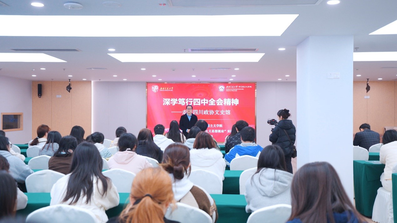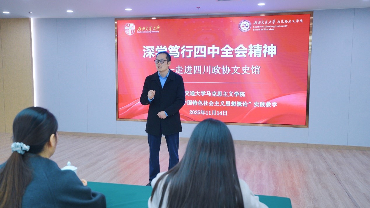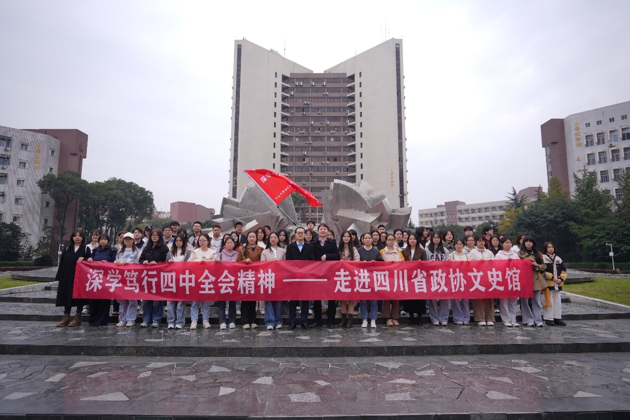 党的二十届四中全会通过的《中共中央关于制定国民经济和社会发展第十五个五年规划的建议》指出要“实施新时代立德树人工程,促进思政课堂和社会课堂有效融合”。开展习近平新时代中国特色社会主义思想概论课程教学,特别是在开展中国特色政党制度这部分的教学之时,要横向贯通理论小课堂与实践大课堂,使学生们在参观考察中学深悟透习近平总书记关于加强和改进人民政协工作重要思想的真理魅力、实践伟力和中国特色政党制度的独特优越性、强大生命力。2025年11月14日下午,76net必赢线路检测中心习近平新时代中国特色社会主义思想概论课教研室7位老师带领教改实验班学生一行近七十人走进四川政协文史馆,了解四川省政协70年的光辉历程,感悟中国共产党领导的人民政协鲜明的中国特色和显著政治优势,将“思政小课堂”搬进四川政协文史馆,搭建起历史与现实、理论与实践相汇通的桥梁,开展了一堂精彩纷呈的“文史馆里的大思政课”,引导学生深学笃行党的二十届四中全会精神。